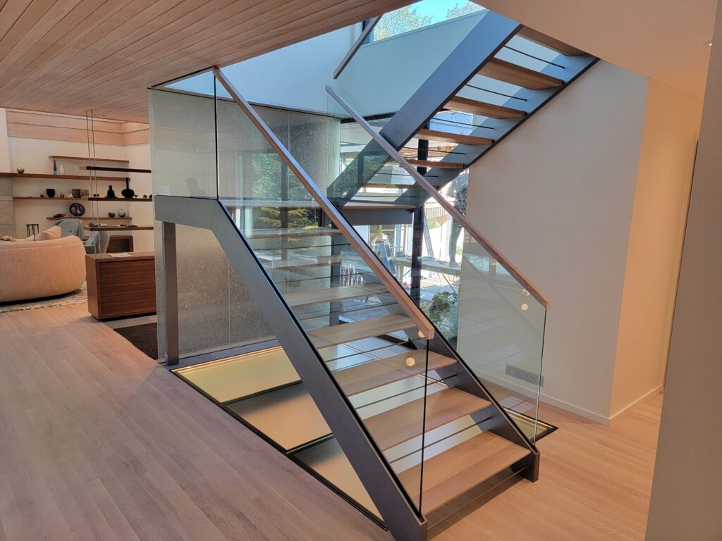 This private residence had us building custom steel plate stringers to support the sleek glass rails on the inside, a glass wall and glass floor were also incorporated into the main staircase area, as well as stainless steel cable rails on all 3 decks and custom galvanized columns to support the overhangs and walk path roof.